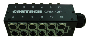 CRM-12P的構成要件是由24個CONTECH鋅鋁合金系列插座及強硬的金屬材料構成的麥克風盒,它的每一個輸入都有一個平行信號的輸出, 這樣是為了我們在串接信號時不致無信號輸出時使用, 舉例來說當我們將舞台上的信號透過多軌導線送到台下時,我們需要在舞台上額外的增加一個監聽信號時,就可以利用這個裝置在舞台盒上即時的輸出端, 不必將信號來回的傳送,那樣的做法除了信號有較多的衰減外也增加纜線的花費,他並且有一個強力的迫緊環用來固定多軌信號線體的連接,(並可選購拉力鎖來保護線材在出線時容易折彎的損壞) 它提供給一般固接式的聲音在現場的表演上所使用, 簡單的拆卸及按裝就可以很穩固的完成使用者的需求