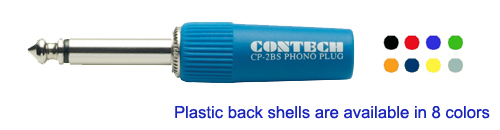 CONTECH 2BS插頭, 是由2個零件所購成的6.3mm非平衡式耳機插頭, 它是針對機櫃裝配時有限的狹小空間而設計, 它的外殼是用有彈性且輕量的塑膠材料,它適用6mm的導線,達到完全遮蔽防塵的特性. 它的中心導體則是採用高導電特性的加厚金屬管及耐熱的電木做為隔離片.適合用於一般工程使用.