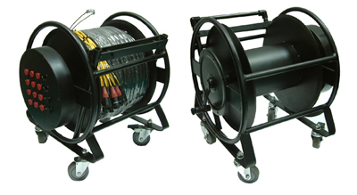These solidly constructed drums are suitable for many uses in recording, live entertainment and outside broadcast, and are particularly useful for the construction of audio multicore systems. The steel drum is supported on one side with a spindle constructed from 40 mm steel. This means that a central axle is not required to be attached on both sides allowing useable panels to be mounted on one side of the drum. At last the revolving stagebox. The centre of the drum has a large aperture with an optional quick release plate for stowing cable tails. A drum brake is also included as standard. Alternatively, the drum itself can be used as a stage box using one of the 16, 24, or 32 holed XLR mounting side plates, making a small easy to set up and take down rig possible.