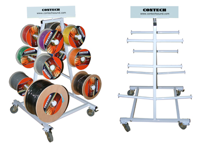 Thia ia a CONTECH bulk cable reel storage rack that can easily accommodate 16 audio cable and 4 multicable. Extra heavy duty gauge steel frame that includes 6 industrial strength locking ring, so rack stays put when you pay out cable, system installation job sites or professional wire shop.