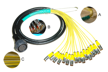Contech road series' Fan cable are made by Contech CM2F-16C series multicable and combine with Syntax multipin to stand up to the rigours of professional touring. individually jacketed shielded has fit in a tansparent PVC tube and numbered pairs offer exceptional performance and easy maintenance large configurations feature grouped layers and because the outer jacket is extruded hot, one end is fixed with our hanger grip to protect the cable. Syntax multipin end is made of crimp pin procedure instead of solder.