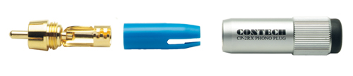 Professional RCA plug with solid gold-plated contact and Taflon insulator. Knurled metal shells are available in black paint or Trivalent Chrome plated finish. CONTECH unique rubber bushing provides strong resistance to cable bending and perfect shelter from dust, for cable diameter from 2.8mm to 7.5mm. 2 choices of cable clipping system -- 1) A huge gold-plated copper clamp securely grips cables above 6mm diameter. 2) An additional 360 POM clamp for additional relief and for smaller cables, providing 100% insulation between insert and metal shell.